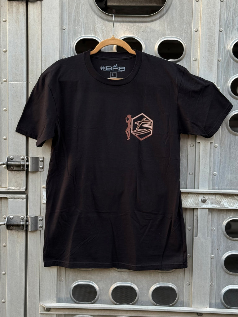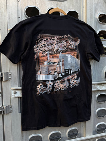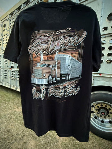 “If you can’t feed ‘em, don’t breed ‘em!” BRB T-shirt featuring Blake and Barbie’s old 1999 Peterbilt 379 “BIG TAN”